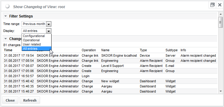 يتم سرد أي تغييرات تم تطبيقها على الكائن الحالي في سجل التغييرات الخاص به. يُظهر المستخدم الذي قام بالتغيير ومتى تم تطبيقه. لفرز القائمة، انقر على رؤوس الأعمدة. لعرض جميع التغييرات في جميع أنحاء النظام، حدد إظهار سجل التغييرات على الكائن الجذر. حدد عدد الصفوف باستخدام مرشحات النطاق الزمني والعرض.