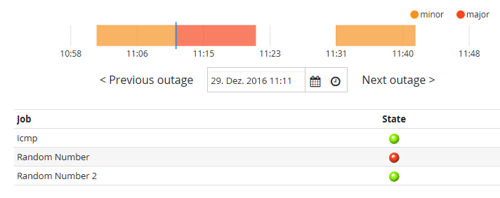 Il widget Outage History estende le funzionalità di altri widget dipendenti dal tempo e dallo stato attraverso un grafico navigabile, basato sugli elenchi di interruzioni forniti dallo SKOOR Engine. Può essere utilizzato per visualizzare solo le interruzioni di un intervallo di tempo preselezionato o, con la navigazione abilitata, anche per controllare altri widget dipendenti dal tempo. Utilizzando i pulsanti "Interruzione precedente" e "Interruzione successiva" o il selezionatore di data e ora, l'indicatore blu verrà spostato tra le interruzioni visibili nel widget. Gli altri widget del cruscotto che dipendono dal tempo cambiano e visualizzano i loro stati nello stesso momento.